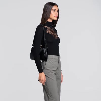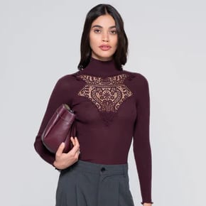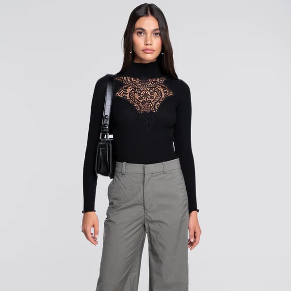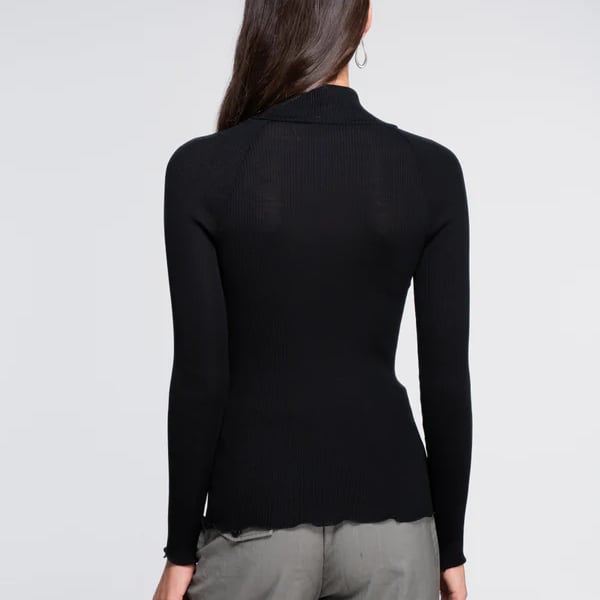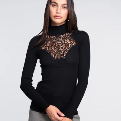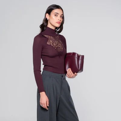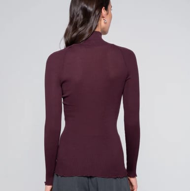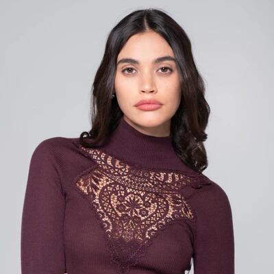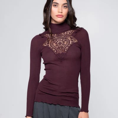 ハイネック/マクラメレース/リブ/秋冬<ブラック・ダークチェリー>ウール シルクNo.557608【オスカリート/Oscalito】